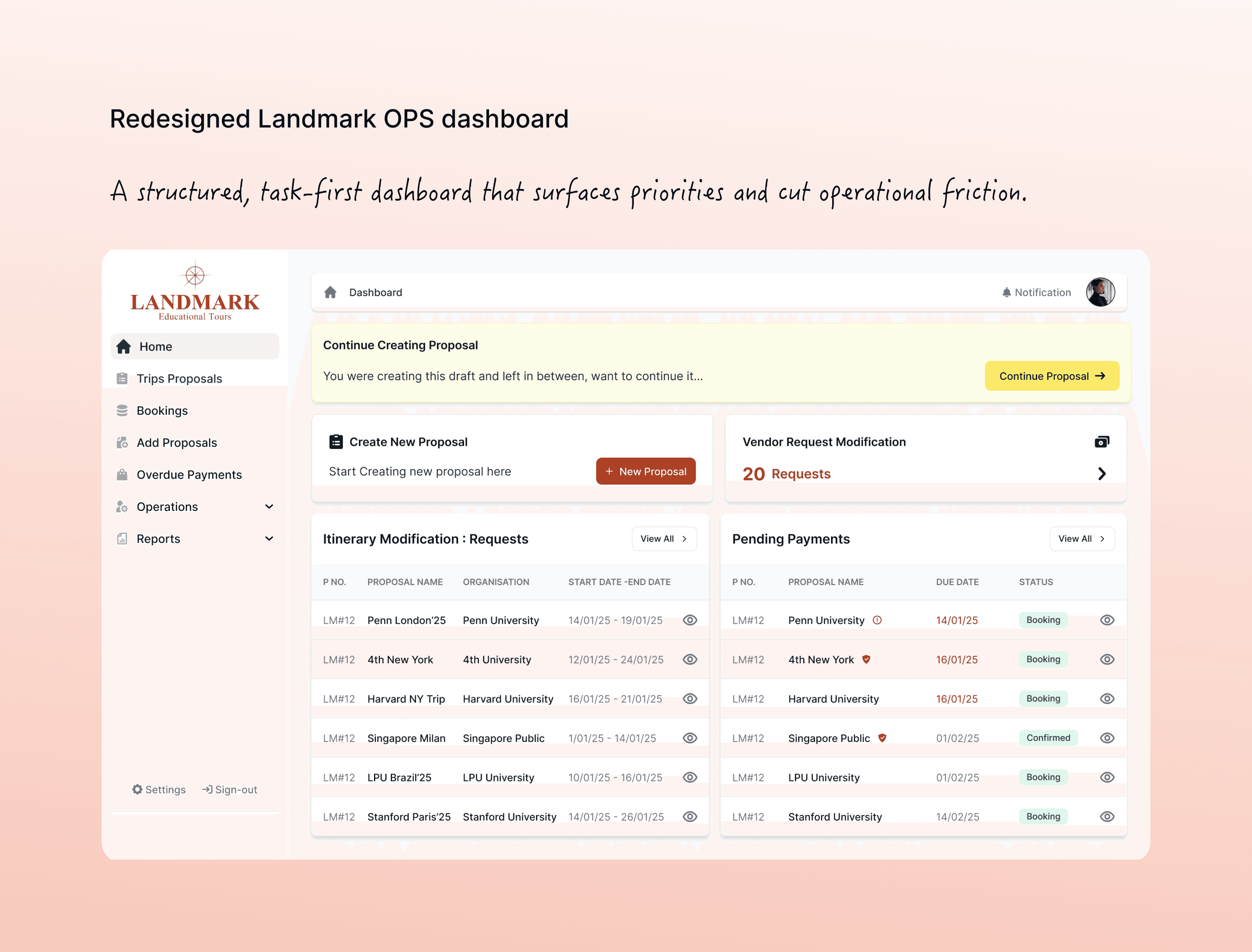Landmark serves a multi-role ecosystem where institutions drive most interactions, vendors handle operational fulfillment, and admins ensure oversight. The UX needed to balance clarity across all three roles.